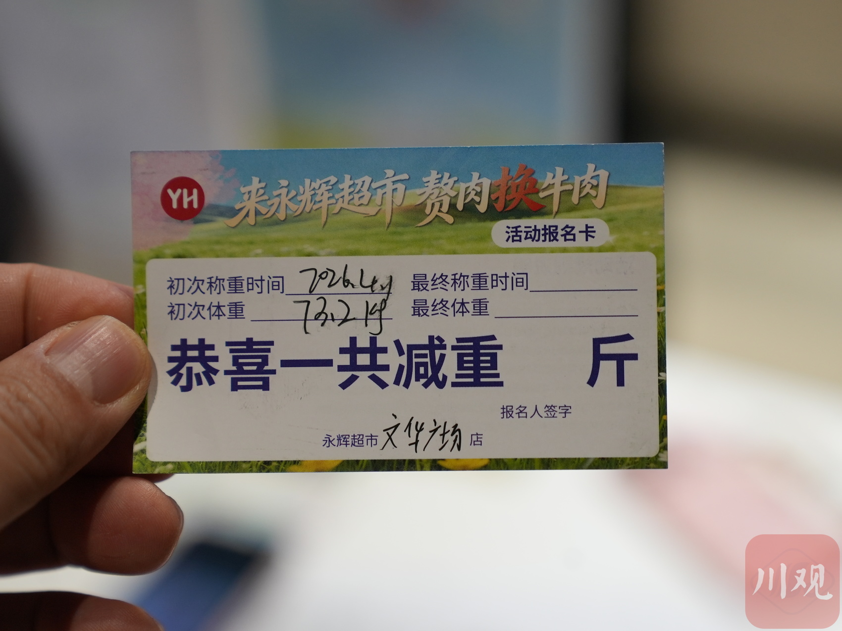 上午10点,永辉锦江文华店客服台前,十几位市民正排队登记、脱外套称重。28岁的张小姐和闺蜜一起填完表,站上电子秤时忍不住笑:“早就想减春膘,一直没动力,现在减3斤就能换1斤牛肉,相当于‘肥肉变现’,必须坚持!”