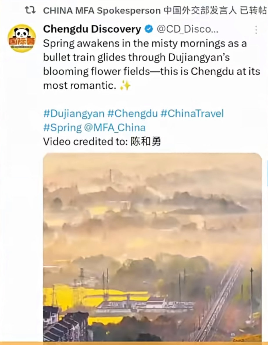 朦胧晨雾中,动车穿行在都江堰的田园花海……前不久,一幅来自成都的“千里江山图”获得全球网友赞美。此前,锦城湖的冬季限定美景、二环高架“成都版绿野仙踪”,先后被重磅推介。