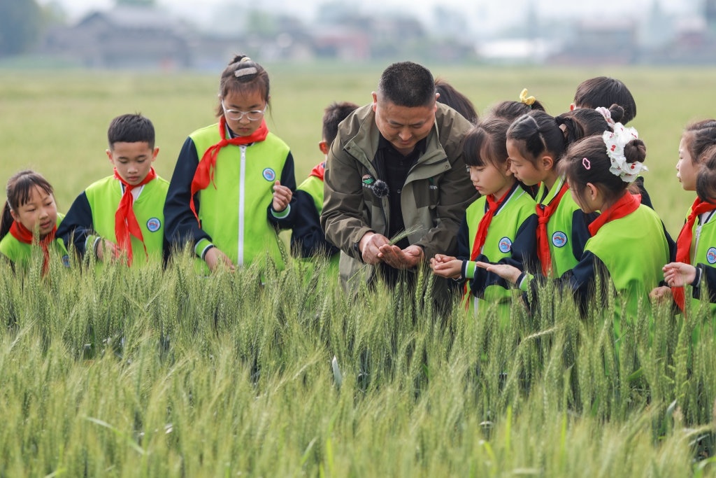 4月1日,在四川省眉山市彭山区观音街道兴崇社区千亩粮油基地,农业技术人员在田间为鹏利小学学生科普小麦播种技术、生长周期及现代农业科技应用等知识。