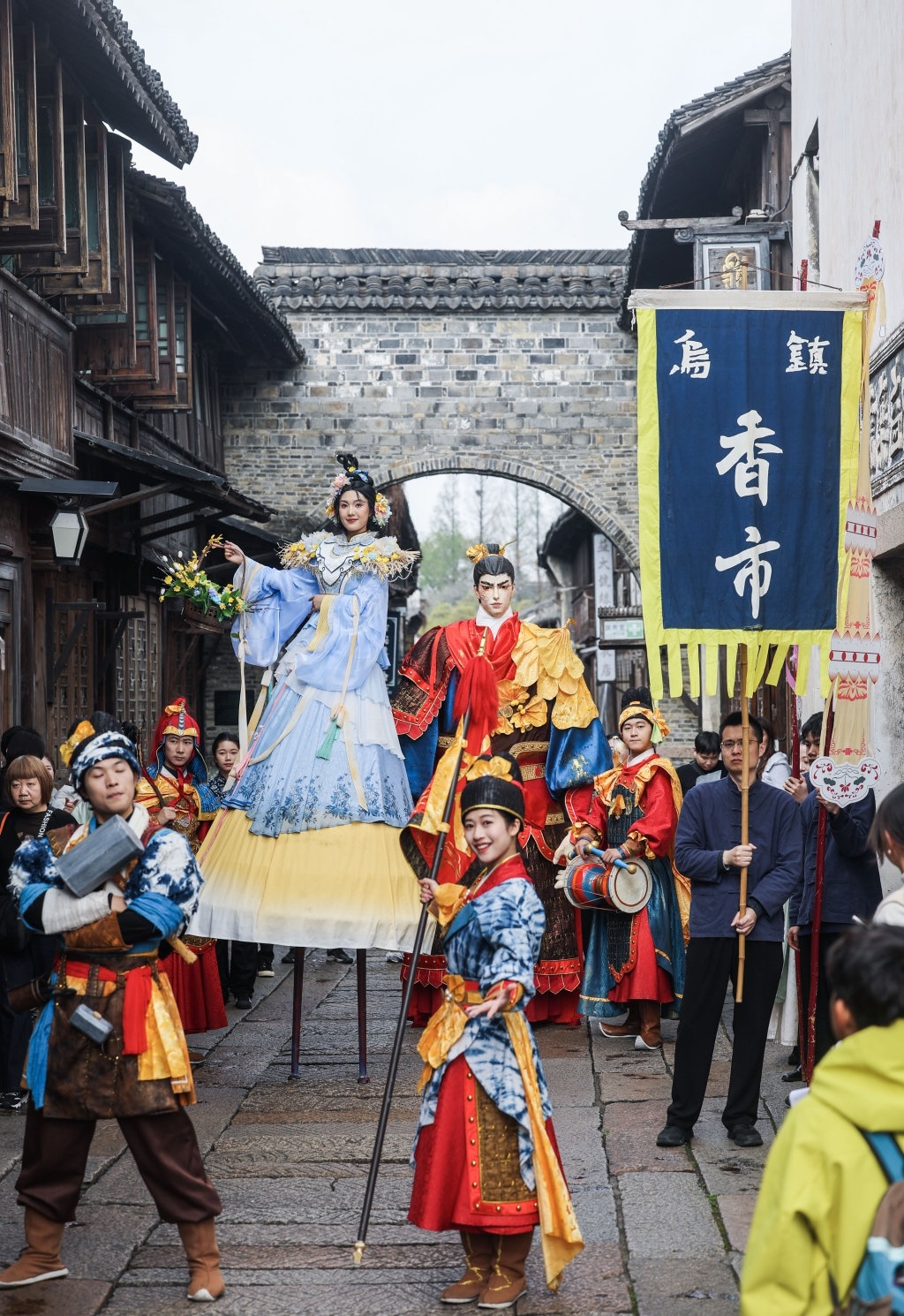 4月1日,乌镇香市蚕花盛会的巡游队伍在古镇的街市上表演。
