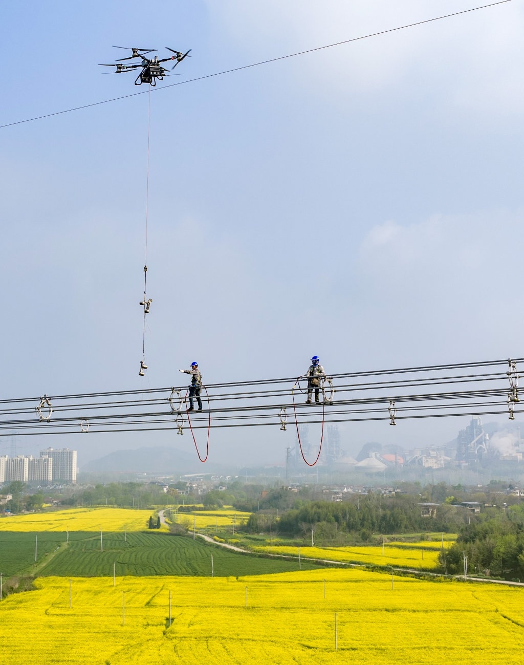 4月1日,在安徽省芜湖市繁昌区境内,安徽送变电工程有限公司施工人员在甘肃—浙江±800千伏特高压直流输电工程施工现场作业(无人机照片)。