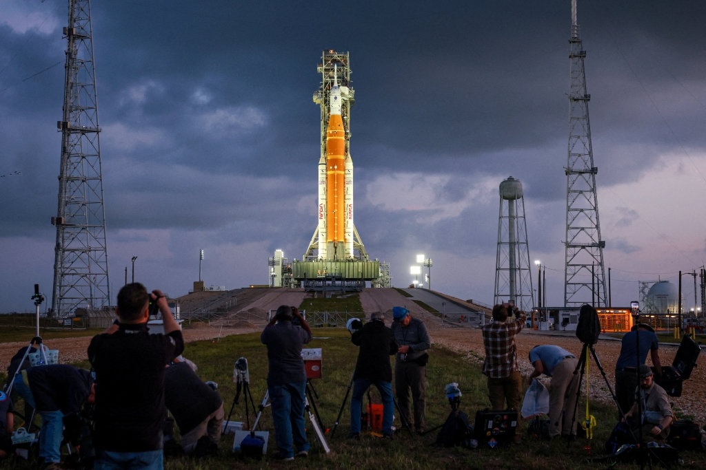 当地时间3月31日,在美国佛罗里达州肯尼迪航天中心,人们架设摄像机拍摄美国新一代登月火箭“太空发射系统”及其搭载的“猎户座”飞船。