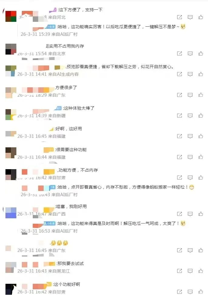 压缩包预览能力正在逐步覆盖,不少网友评论“太实用了”、“不占内存”↓