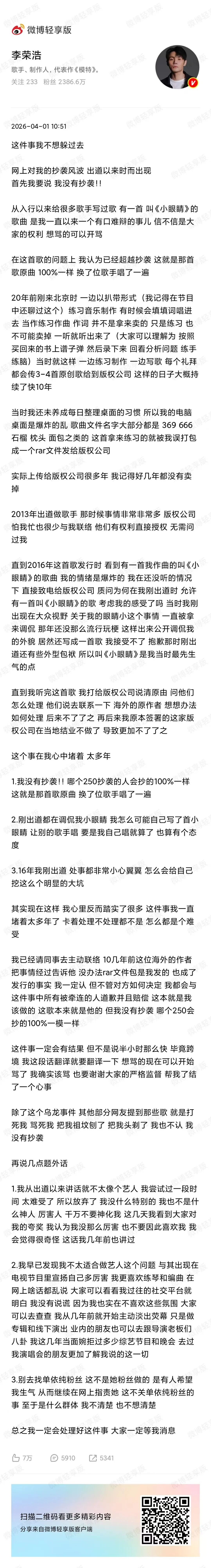 4月1日,歌手李荣浩发长文回应《小眼睛》被指抄袭,他称2000年代在北京从事音乐幕后工作时,曾将平井坚《Signal》的扒带练习文件(填词翻唱版)误打包发送给版权公司,后续因签约公司倒闭、沟通中断,导致2015年署名自己作曲的《小眼睛》被蔡淳佳发行。他坚称这是“误传非商用练习作品”,否认抄袭,并表示已主动联系海外原作者处理赔偿。