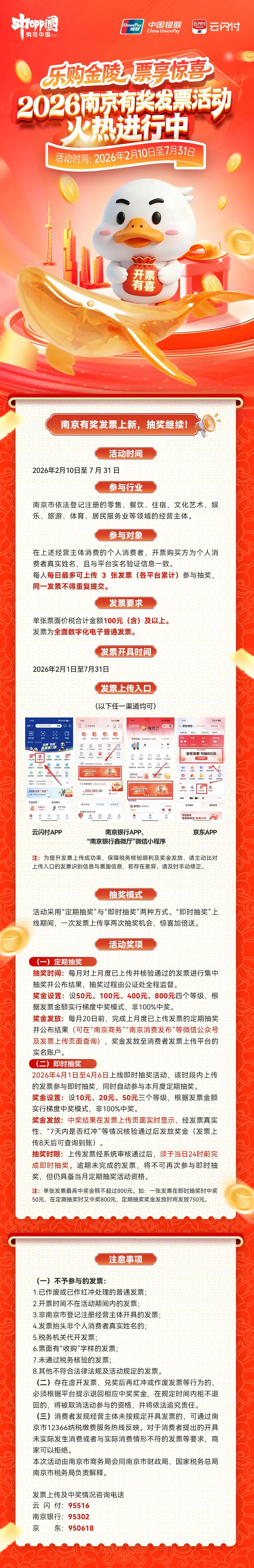个人消费者在全市零售、餐饮、住宿、文化艺术、娱乐、旅游、体育、居民服务业等八大民生领域消费,并取得单张票面金额100元(含)以上的全面数字化电子普通发票,开具时间为2026年2月1日至7月31日,即可参与抽奖,单张发票奖金10-800元不等。可通过云闪付App、南京银行App、南京银行鑫微厅、京东App等平台入口参加,参与步骤请见→上攻略,上攻略,上攻略,重要的事情说三遍!