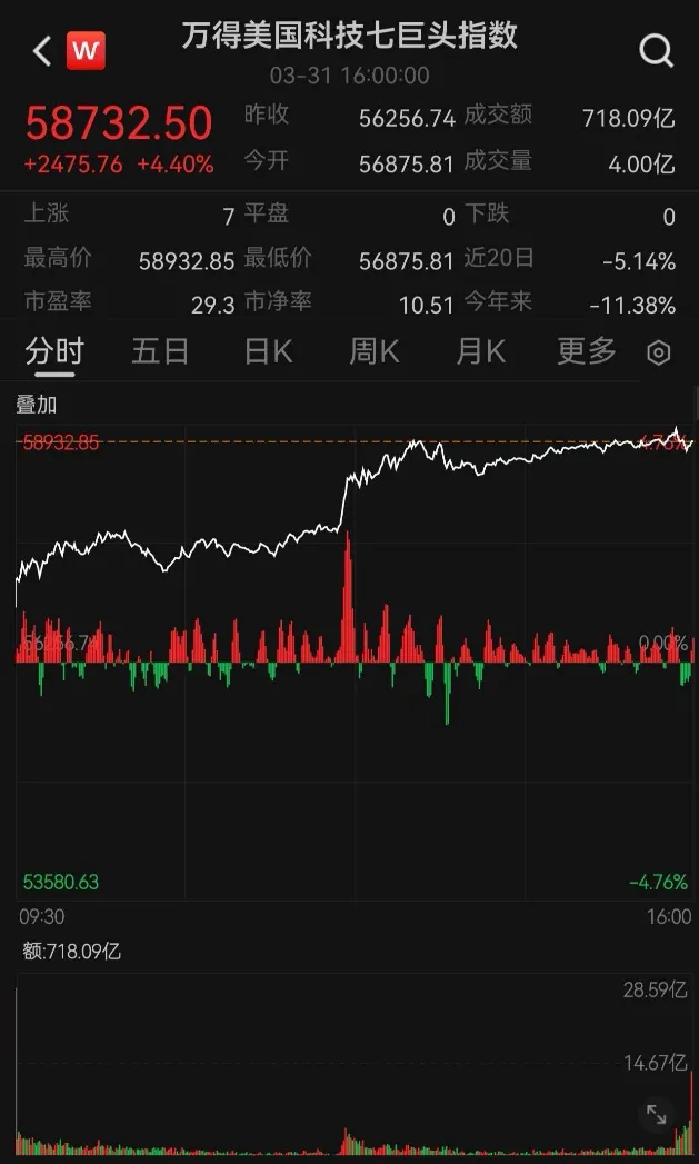 大型科技股集体上涨,万得美国科技七巨头指数上涨4.4%。个股方面,Meta涨超6%,英伟达、谷歌涨超5%,特斯拉涨逾4%。