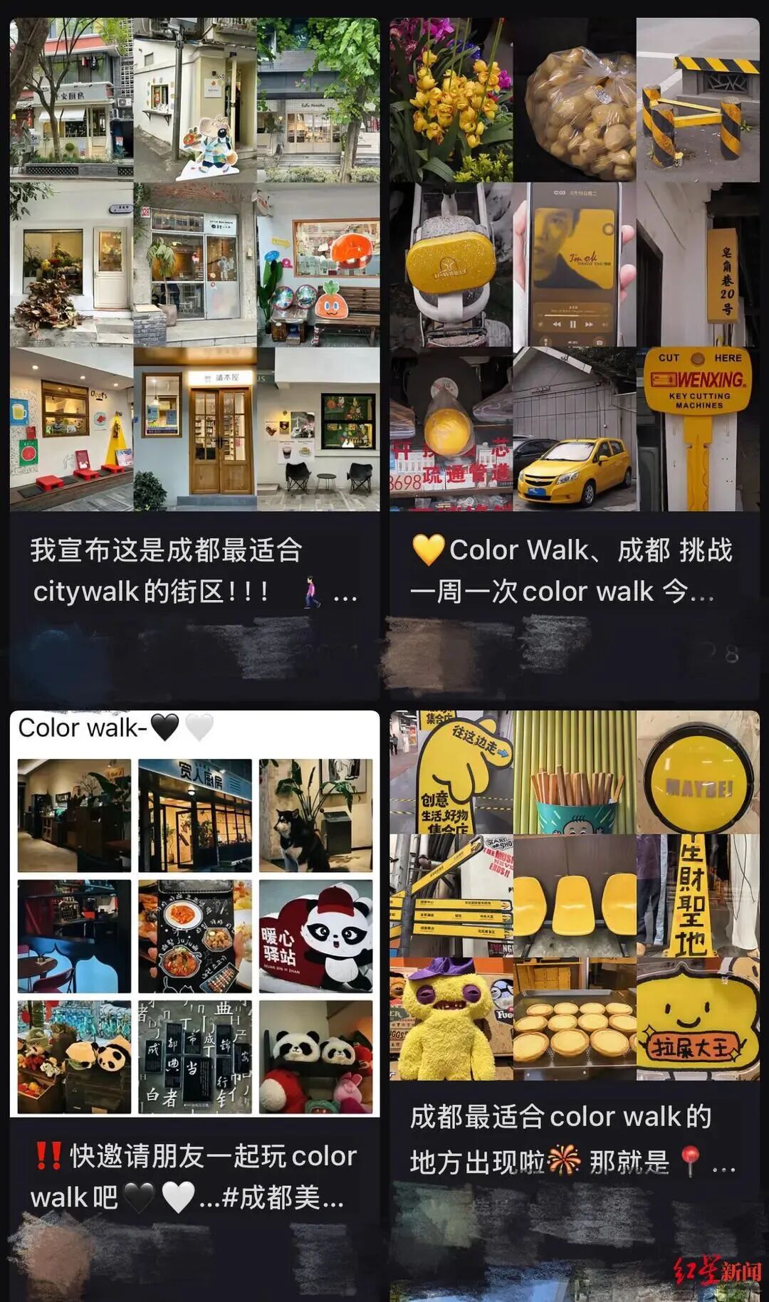 她不知道的是,近日,成都至少有数千名年轻人做着类似的事——选定一种颜色,走上街头,捕捉与之相关的一切。这个被称为“colorwalk(色彩漫步)”的玩法,已成为今年春季最火爆的出游趋势。