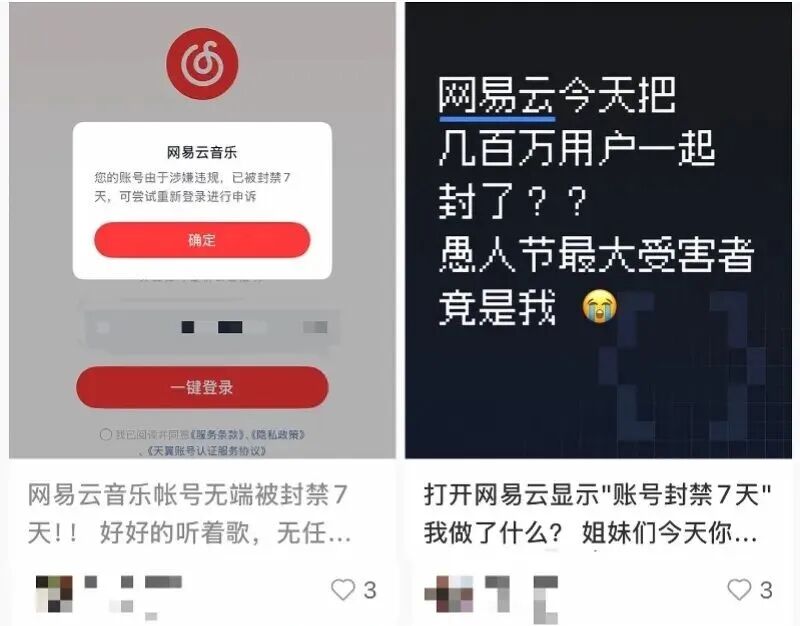 记者注意到,4月1日,多名网易云音乐用户在社交平台发文表示,“自己的账号被封禁”。据用户发布的信息,网易云音乐登录界面显示,“您的账号由于涉嫌违规,已被封禁7天,可尝试重新登录进行申诉。”不少用户表示,“自己没有任何违规操作”。