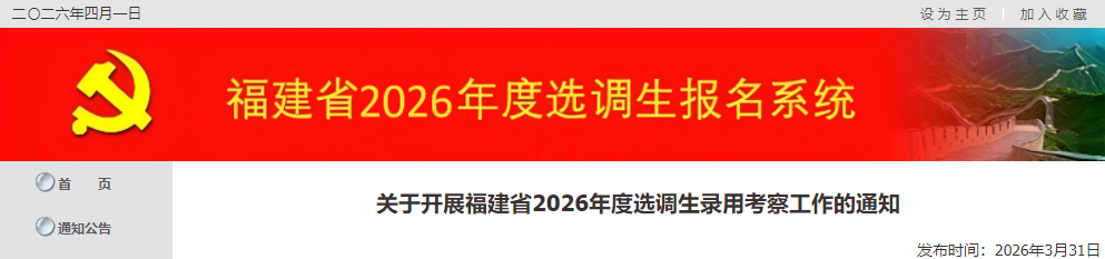 根据《公务员录用考察办法(试行)》等有关规定以及福建省2026年度选调生选拔工作安排,从4月7日(星期二)开始,福建省委组织部将派出考察组赴有关高校开展2026年度选调生录用考察工作。
