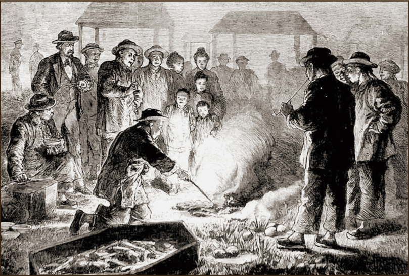 美国旧金山华侨对死去的同胞举行骸骨“捡金”祭奠仪式。中国华侨历史博物馆供图