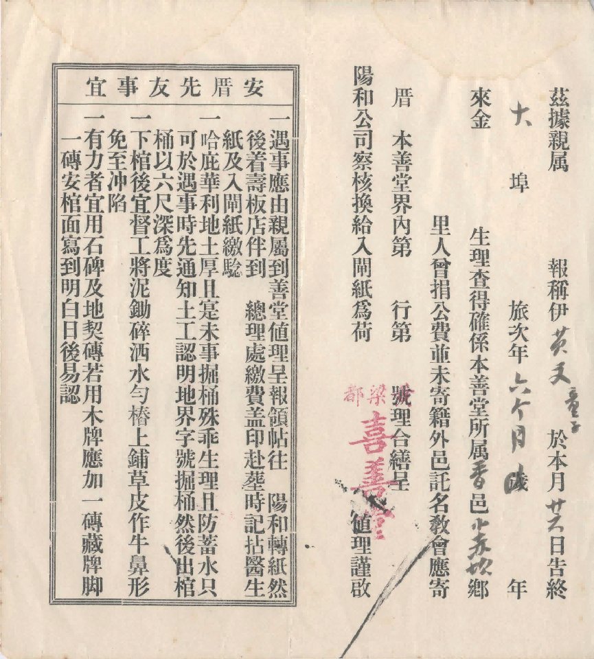 侨博馆藏的这件美国阳和会馆黄粱都喜善堂的入闸票,正是这段历史的鲜活见证。这是善堂发放的安葬凭证,会员缴费后,方可安葬在会馆的坟场内。等待时机成熟后,可由善堂组织运送遗骸回乡,真正的魂归故里。票面左侧写的是安葬流程,右侧则详细标注逝者年龄、卒年、籍贯,落款为经办善堂。其中的一笔一画,都是侨胞对先人的敬重,更是侨社守望相助的承诺。