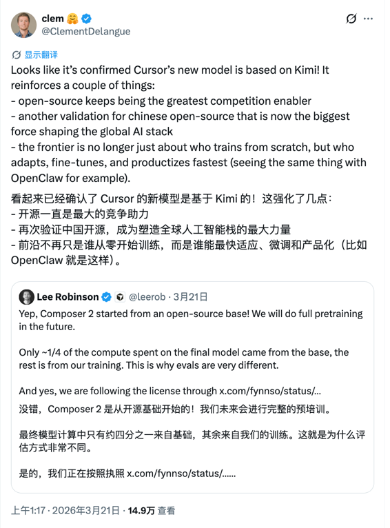 这背后其实是极其理性的“真香”定律。Cursor的联合创始人Aman Sanger说得非常直白:“K2.5被证明是最强的。”Cursor不是没有选择,相反,它主动评估了大量开源基座模型,最终挑中Kimi K2.5,本质上是一场彻底理性的技术决策。