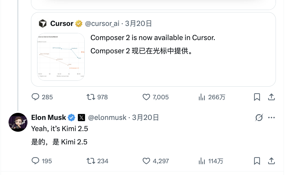 真正把这场风波推上高潮的,是埃隆·马斯克在社交平台上亲自下场“实锤”:“是的,这就是Kimi 2.5。”