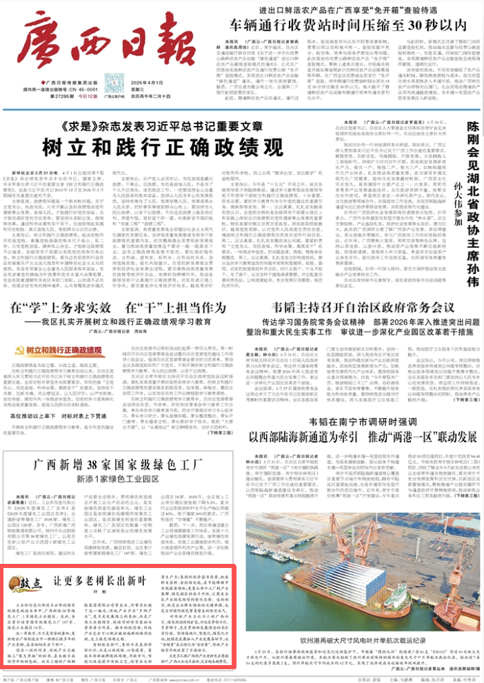 今日(4月1日),广西日报头版刊发“鼓点”评论文章《让更多老树长出新叶》。全文如下——