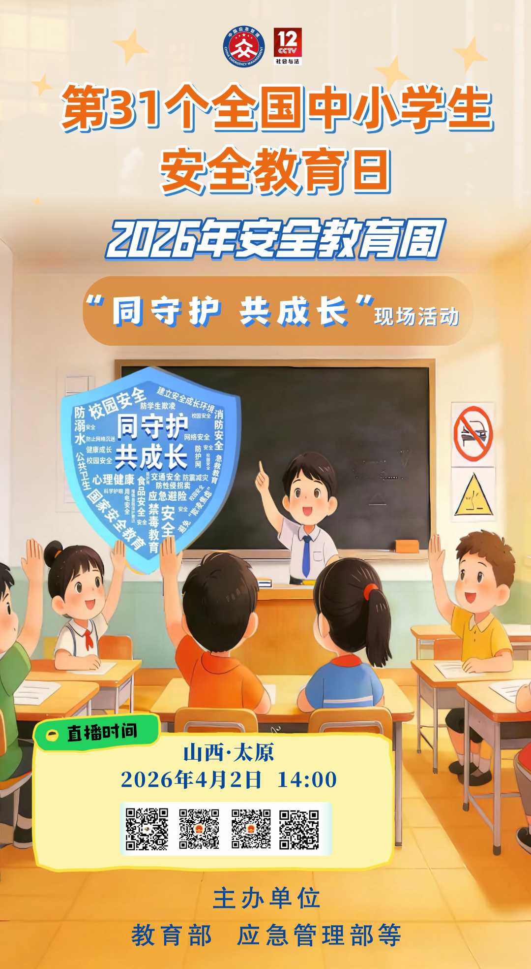 4月2日,教育部、应急管理部等部门将在山西省太原市联合举办第31个全国中小学生安全教育日主场活动,主题为“同守护,共成长”。应急管理部“两微”、抖音、快手,央视频、央视网、总台社教节目中心新媒体矩阵等平台同步直播。