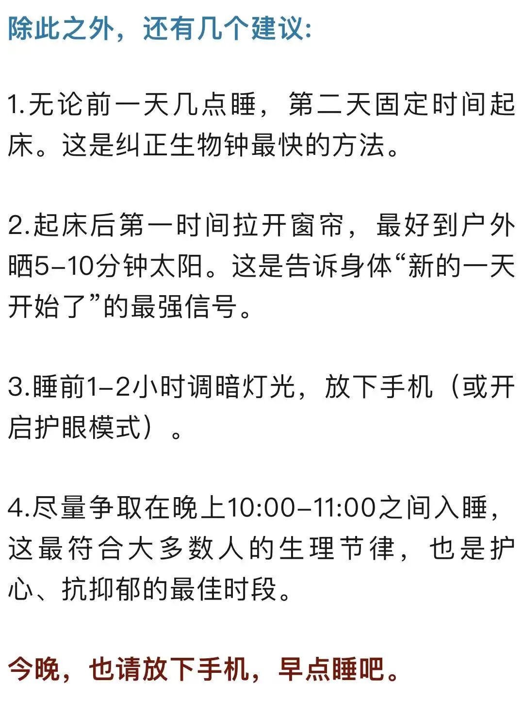 更扎心的是,晚睡还与精神健康密切相关,一项研究发现,将睡眠时间每提前1小时,患重度抑郁症的风险就能降低23% 。也就是说,哪怕你仅仅把睡觉时间从凌晨1点提前到12点,你的心理健康水平都可能得到质的飞跃。即使你是天生的夜猫子,在现行的社会规则下,尽量早睡依然是“保命”的最优解。