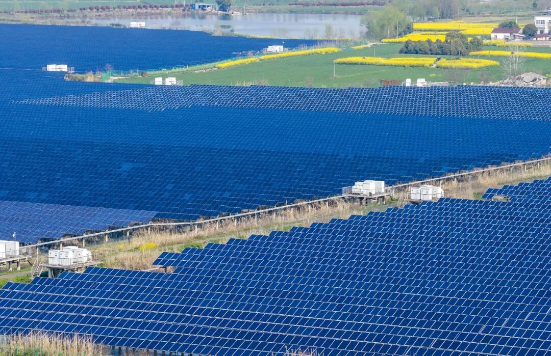 2026年3月29日,安徽省芜湖市繁昌区平铺镇岱湖滩渔光互补光伏电站与民居、田园、水面等相映成景,构成一幅绿色生态画卷。肖本祥摄(中经视觉)