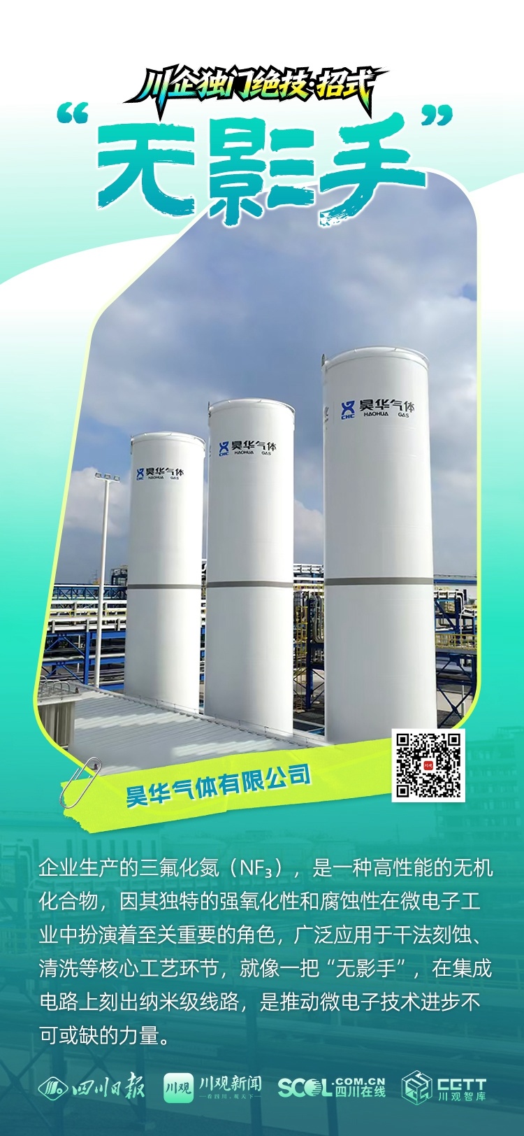 企业独门绝技:“无影手”——企业生产的三氟化氮(NF₃),是一种高性能的无机化合物,因其独特的强氧化性和腐蚀性在微电子工业中扮演着至关重要的角色,广泛应用于干法刻蚀、清洗等核心工艺环节,就像一把“无影手”,在集成电路上刻出纳米级线路,是推动微电子技术进步不可或缺的力量。
