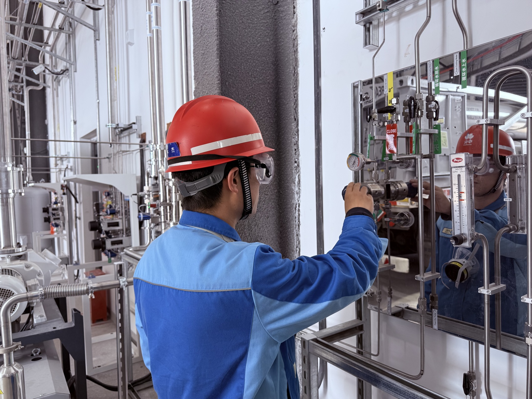 近日,记者走进昊华气体(自贡)有限公司园区,布局规整开阔,主体是多栋银灰色与浅蓝相间的标准化厂房与装置区,高耸的精馏塔、反应釜与交错的银白色工艺管道纵横排布,构成了精密的工业景观。