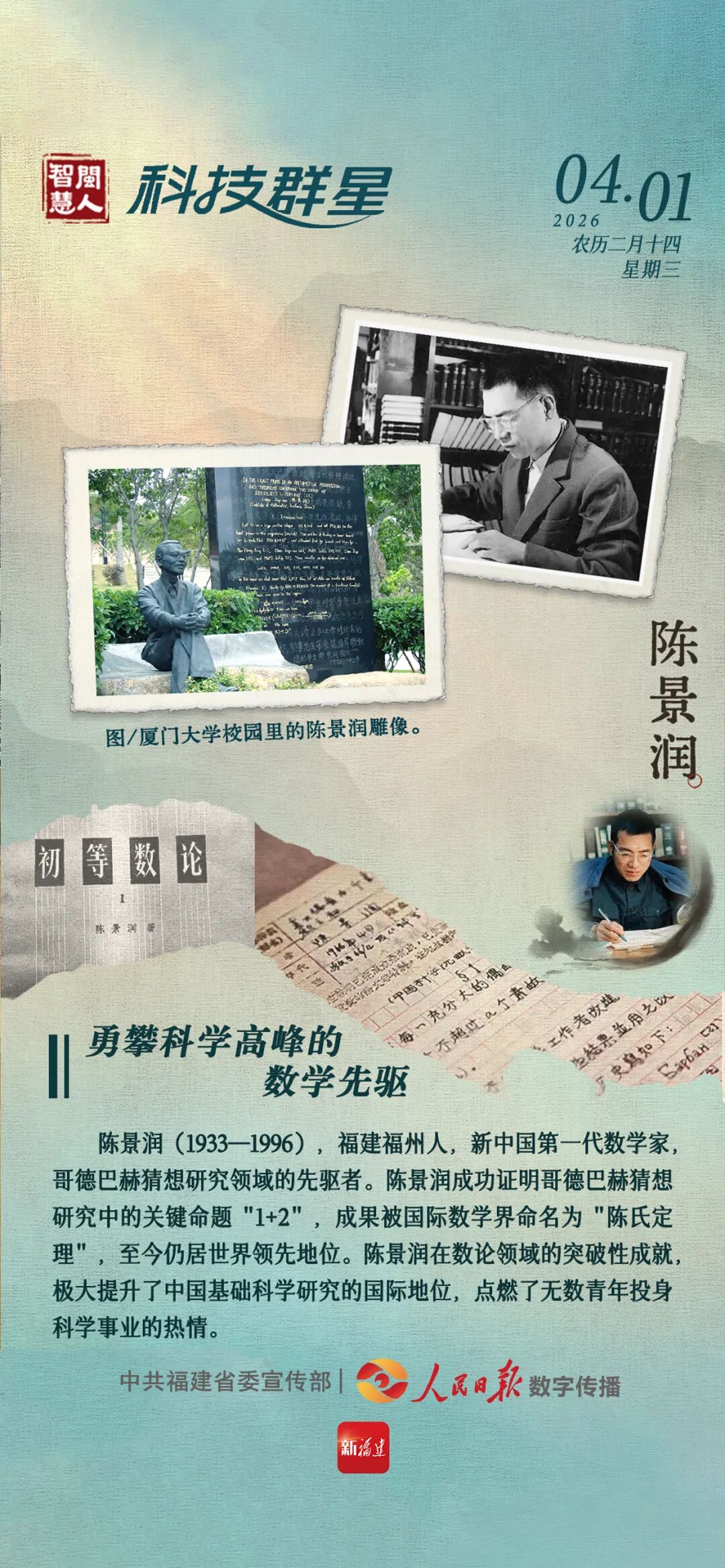 陈景润(1933—1996),福建福州人,新中国第一代数学家,哥德巴赫猜想研究领域的先驱者。陈景润成功证明哥德巴赫猜想研究中的关键命题“1+2”,成果被国际数学界命名为“陈氏定理”,至今仍居世界领先地位。陈景润在数论领域的突破性成就,极大提升了中国基础科学研究的国际地位,点燃了无数青年投身科学事业的热情。