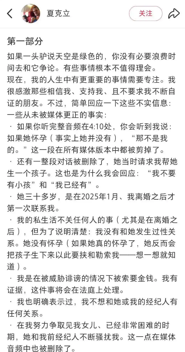 近日,有消息直指夏克立婚内与女儿夏天的女粉丝有不正当关系,并且在对方疑似怀孕时态度冷漠,说出“我不要有小孩”、“跟我没有关系”等话。消息一出,夏克立迅速发文否认,称录音被恶意剪辑,关键对话被删除,并表示已提起法律诉讼。