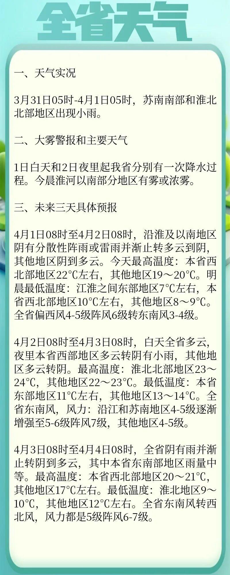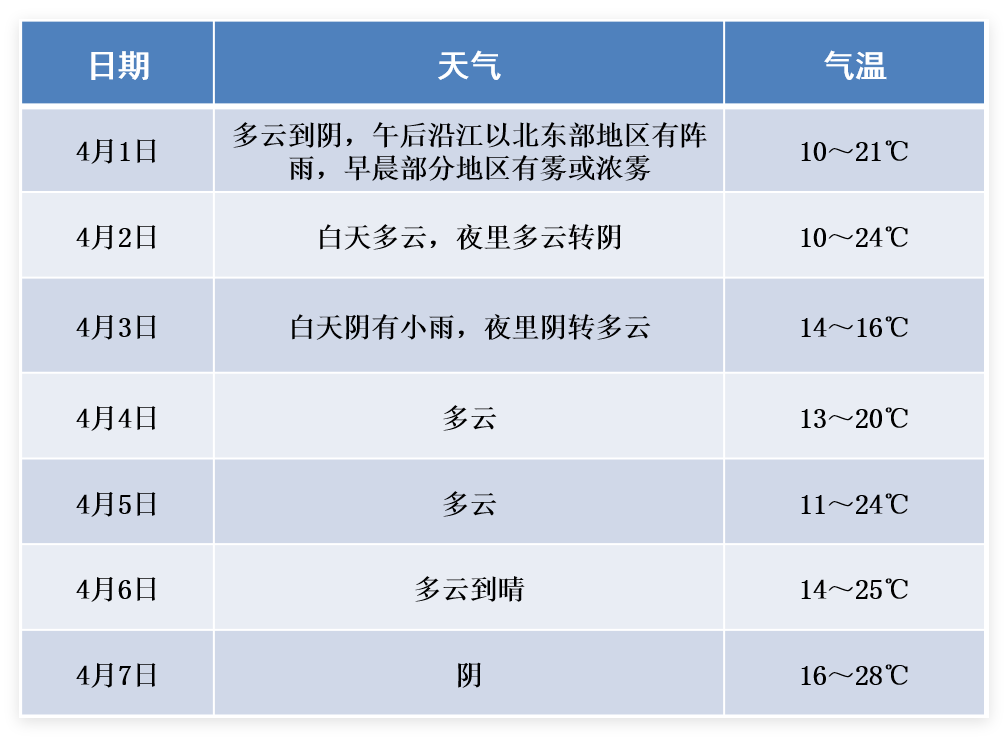 今天凌晨至上午,部分地区有雾或浓雾,午后沿江及北部地区有阵雨。4月3日全市有一次降水过程。建议:雾天能见度低,驾车请减速慢行、保持车距,注意出行安全。