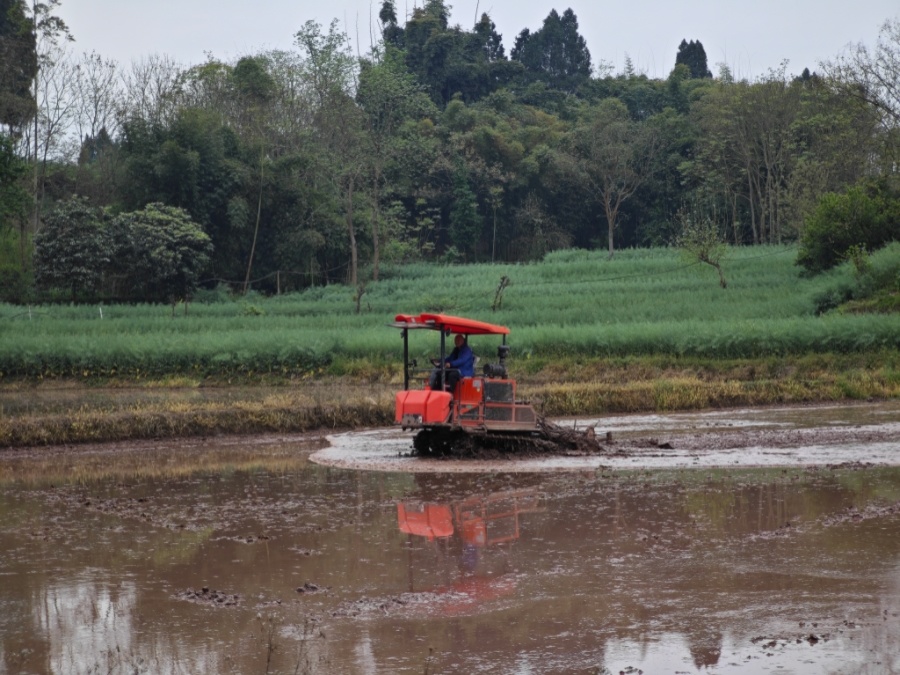 3月27日,乐山市井研县王村镇五农村,清晨的阳光洒在连片成方的田块上。来自宝五镇的农机操作手王勇,正驾驶着履带式旋耕机,在井研县五农幸福之家粮油种植家庭农场的高标准农田里来回穿梭。