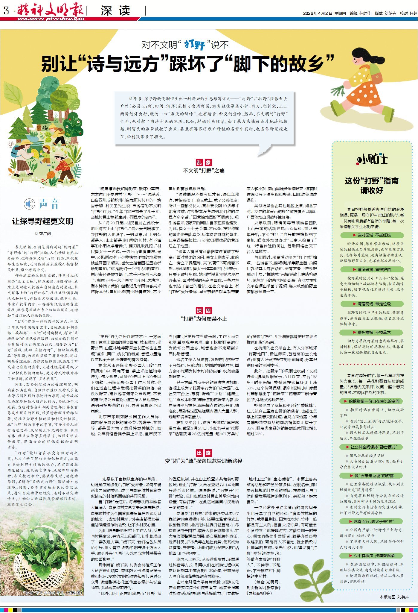 近年来,探寻野趣逐渐催生出一种新兴的生态旅游方式——“打野”。“打野”指春天去户外(公园、山野、田间、河岸)采摘可食用野菜,游客往往带着小铲、剪刀、塑料袋,三三两两结伴出行,既为一口“春天的鲜味”,也有踏青、社交的意味。然而,不文明的“打野”行为,也引起了当地村民的不满。比如,鲜嫩的鱼腥草,由于暴力采摘被成片地连根拔起;刚冒头的春笋被挖了出来。甚至有游客将农户种植的名贵中药材,也当作野菜挖走了,给村民带来了损失。