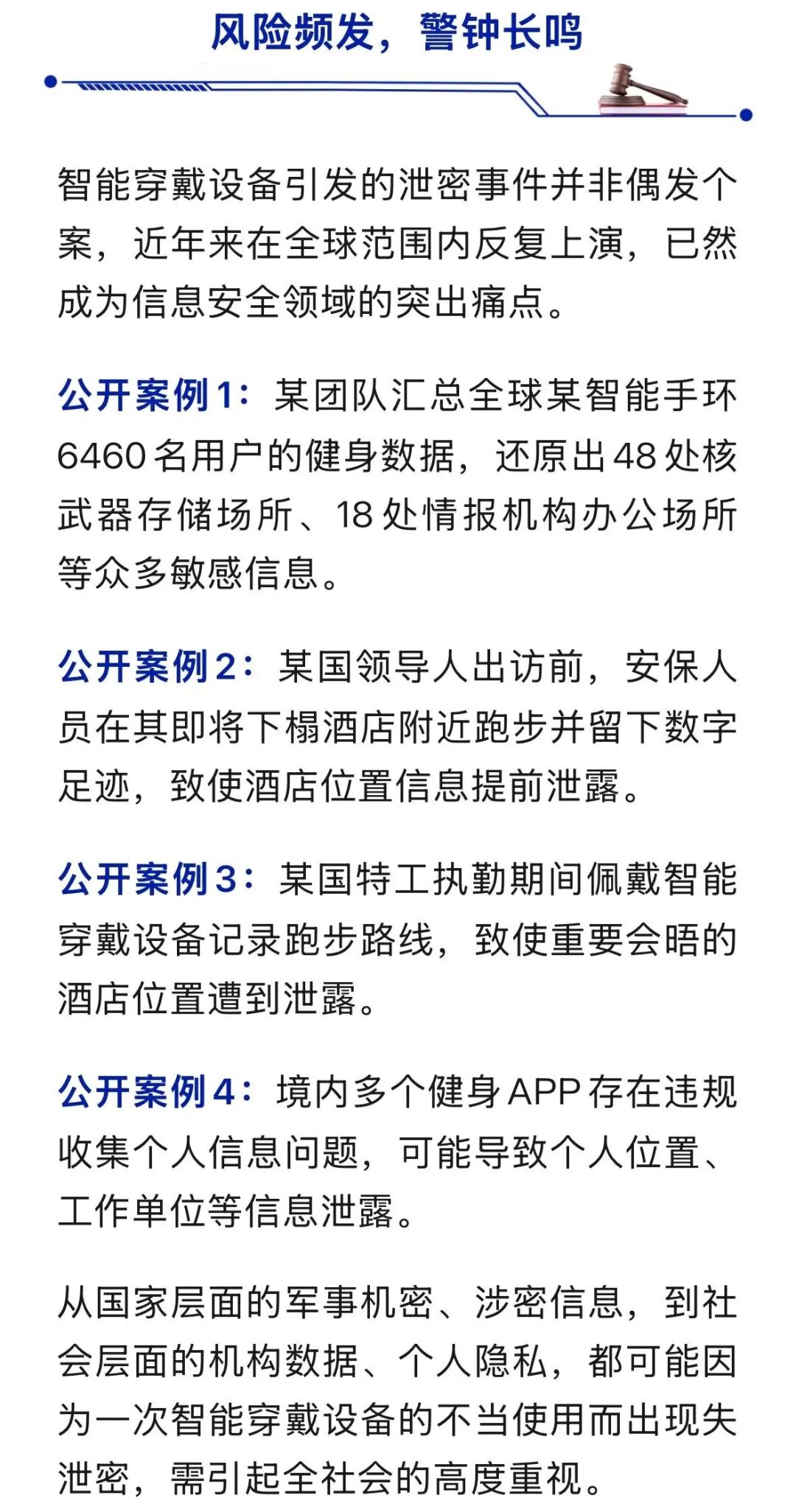 近日,某国发生一起因智能穿戴设备导致的军事机密泄露事件,引发全球关注。当时该国某重要军事装备正在执行任务,一名军官跑步时佩戴的智能运动手表持续记录并公开了高精度GPS数据,致使该军事装备实时位置等重要敏感信息泄露,给该国国防安全造成难以弥补的重大损失,也让智能穿戴设备的泄密风险再次走入人们的视线。