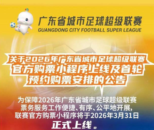 【粤超官方购票小程序上线】粤超官方购票小程序“2026年广东省城市足球超级联赛”已上线,首轮预约购票自2026年4月15日10:00起开放。详情>>>