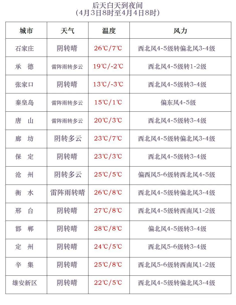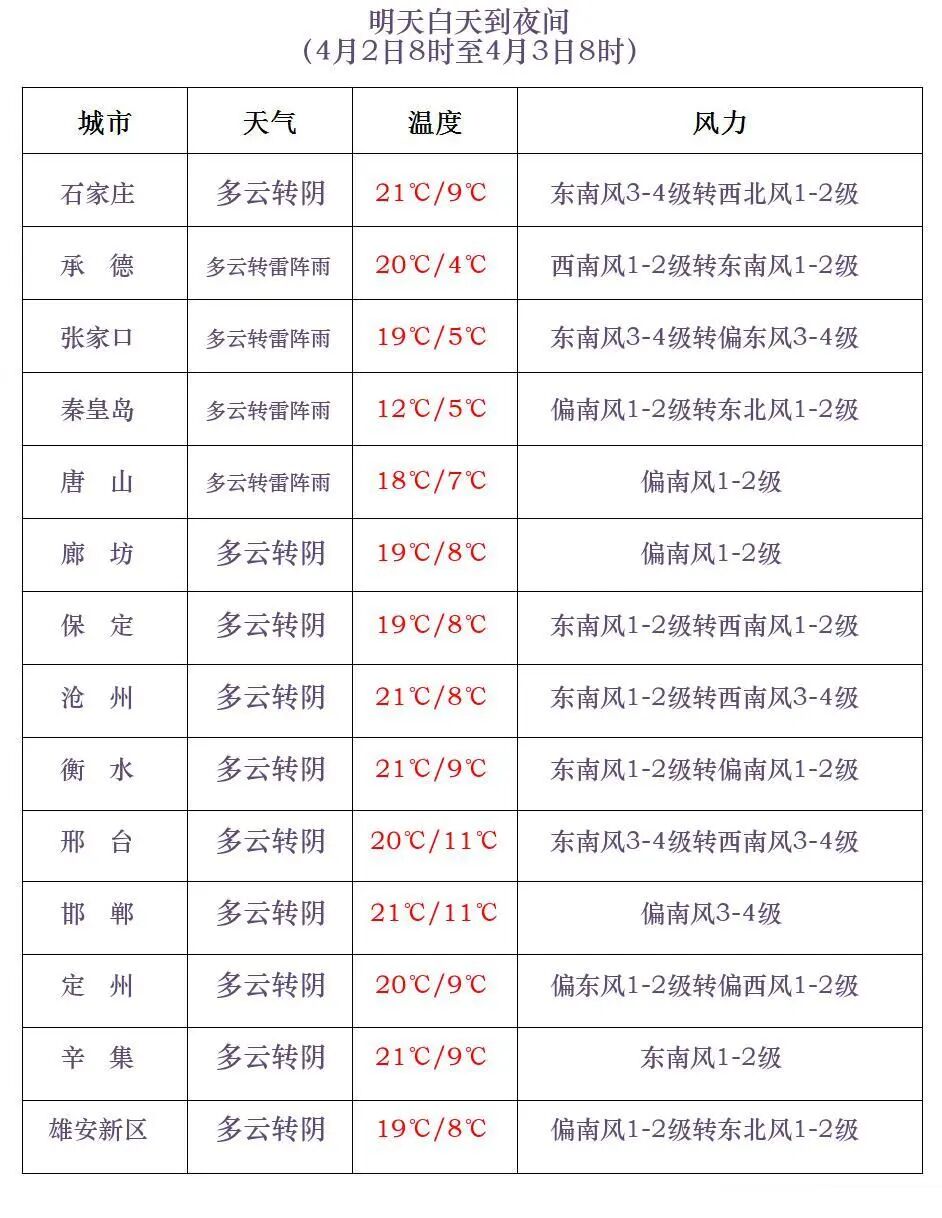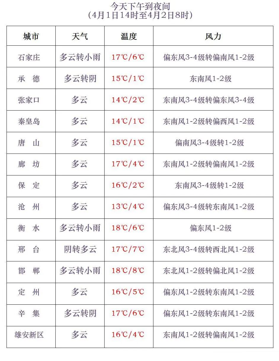 河北省气象台2026年4月1日11时发布天气预报: