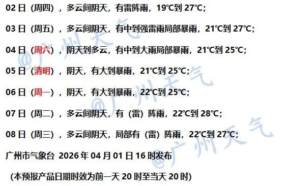 广州市气象台预计,4月2日广州有雷阵雨。4月3日—4日有中到大雨局部暴雨,并伴有短时强降水、8~10级局部11~12级短时大风、冰雹等强对流天气。4月5日—6日仍有明显降水伴强对流过程。