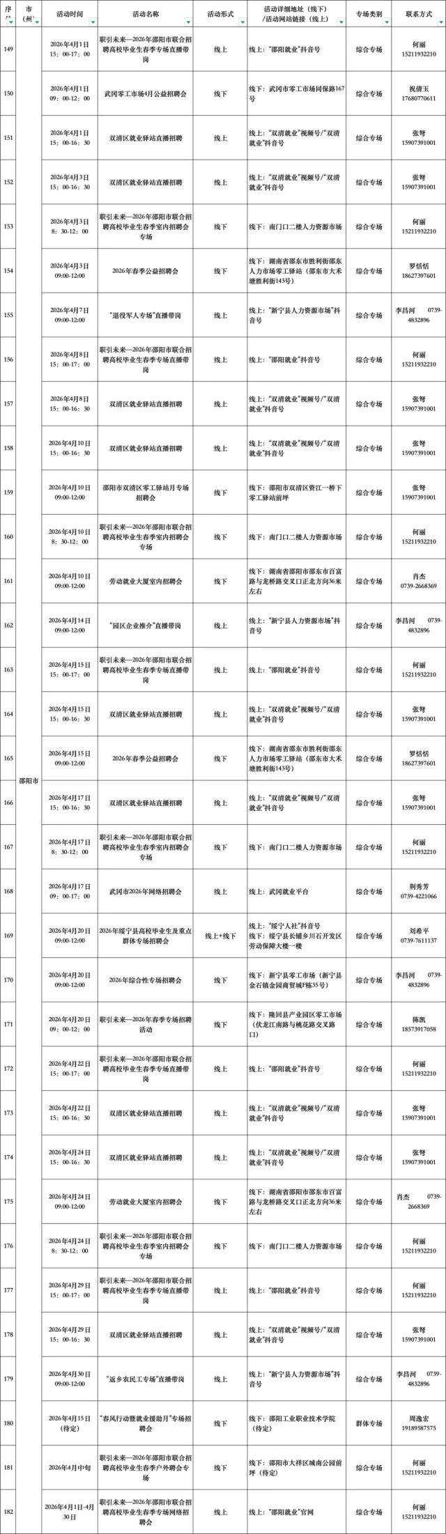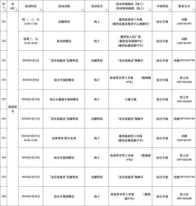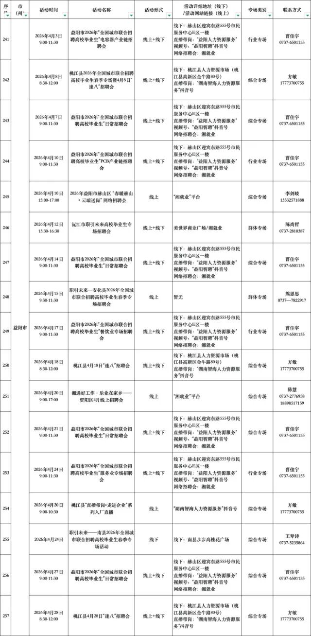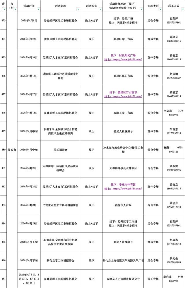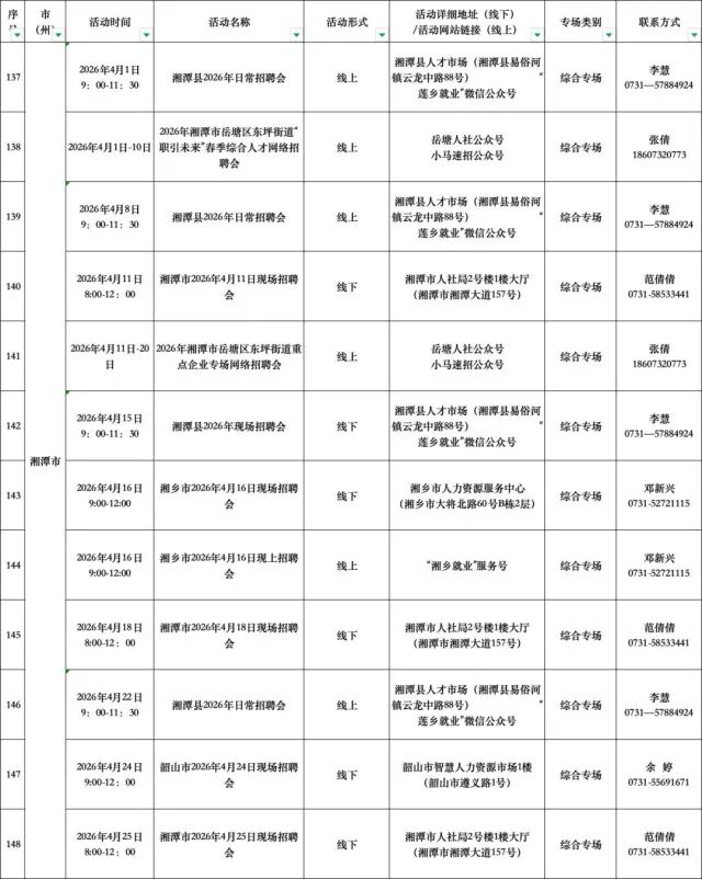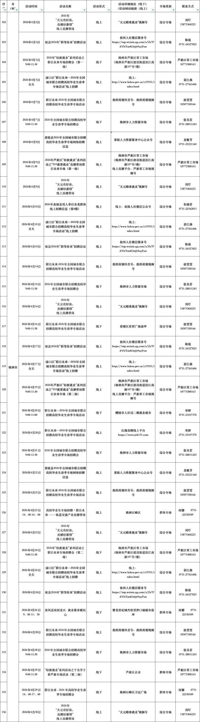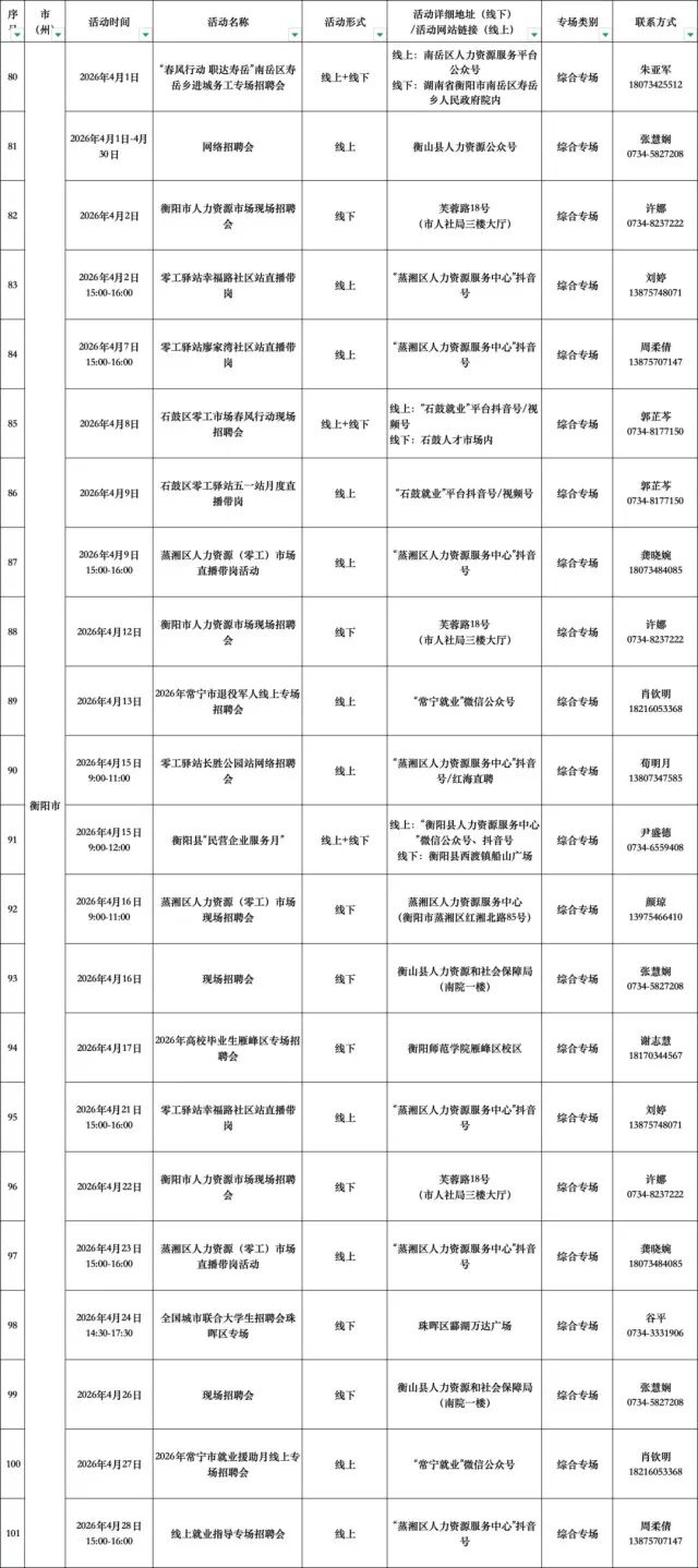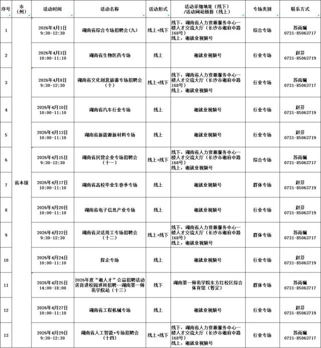 “金三银四”求职季,海量岗位等你来。记者今天从湖南省人力资源和社会保障厅获悉,4月全省的558场招聘活动安排已经出炉。各级公共就业服务机构均有安排,集中为劳动者和用人单位提供求职招聘精准对接服务。具体招聘安排如下↓
