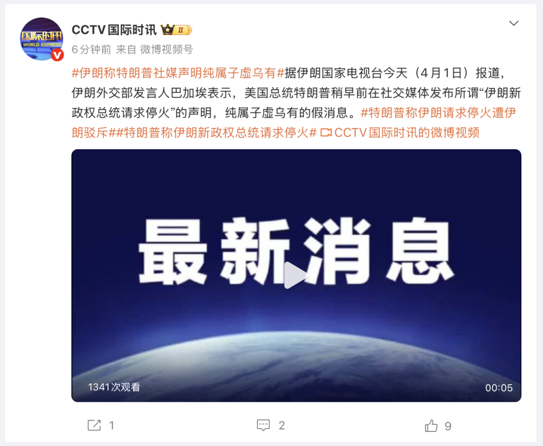 据@CCTV国际时讯 消息,伊朗国家电视台今天(4月1日)报道,伊朗外交部发言人巴加埃表示,美国总统特朗普稍早前在社交媒体发布所谓“伊朗新政权总统请求停火”的声明,纯属子虚乌有的假消息。