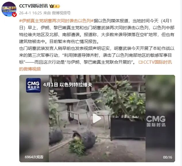 据@CCTV国际时讯报道,据以色列媒体报道,当地时间今天(4月1日)早上,伊朗、黎巴嫩真主党和也门胡塞武装再次同时袭击以色列,以色列中部特拉维夫地区及北部、南部遭袭。报道称,大多数来袭导弹落在空旷地带,但也有建筑物被击中。目前暂未有伤亡情况报告。
