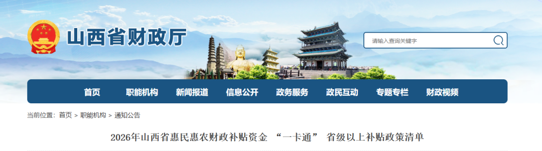 为落实财政部等七部门《关于进一步加强惠民惠农财政补贴资金“一卡通”管理的指导意见》(财办〔2020〕37号)要求和《山西省财政厅等关于加强惠民惠农财政补贴资金“一卡通”管理的实施意见》(晋财办〔2021〕26号)部署安排,山西省财政厅联合13个省级业务主管部门,对2025年惠民惠农财政补贴资金“一卡通”政策清单进行了动态调整,调整后2026年省级以上“一卡通”项目共64项(中央52项,省级12项),现将2026年省级以上惠民惠农财政补贴资金“一卡通”政策清单集中公开,方便公众查询,接受社会监督。