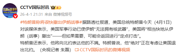 据CCTV国际时讯,据路透社报道,美国总统特朗普今天(4月1日)对该媒体表示,美国军事行动已使伊朗“无法拥有核武器”,美国将“相当快地从伊朗(战事)撤出”——但如果需要,可能会返回进行“定点打击”。