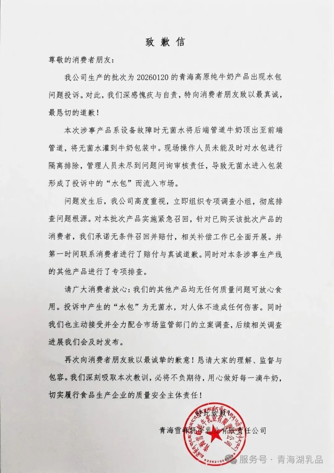 同时,致歉信称,该公司的其他产品均无任何质量问题可放心食用。投诉中产生的“水包”为无菌水,对人体不造成任何伤害。同时,该公司也主动接受并全力配合市场监管部门的立案调查,后续相关调查进展会及时发布。