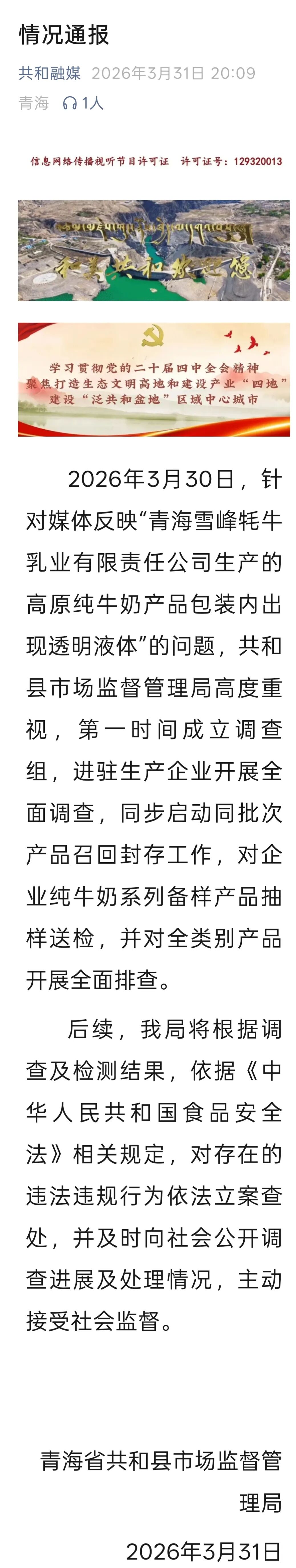 3月31日,青海省共和县市场监督管理局发布《情况通报》,该局对此事高度重视,第一时间成立调查组,进驻生产企业开展全面调查,同步启动同批次产品召回封存工作,对企业纯牛奶系列备样产品抽样送检,并对全类别产品开展全面排查。后续将根据调查及检测结果,对存在的违法违规行为依法立案查处,并及时向社会公开调查进展及处理情况,主动接受社会监督。
