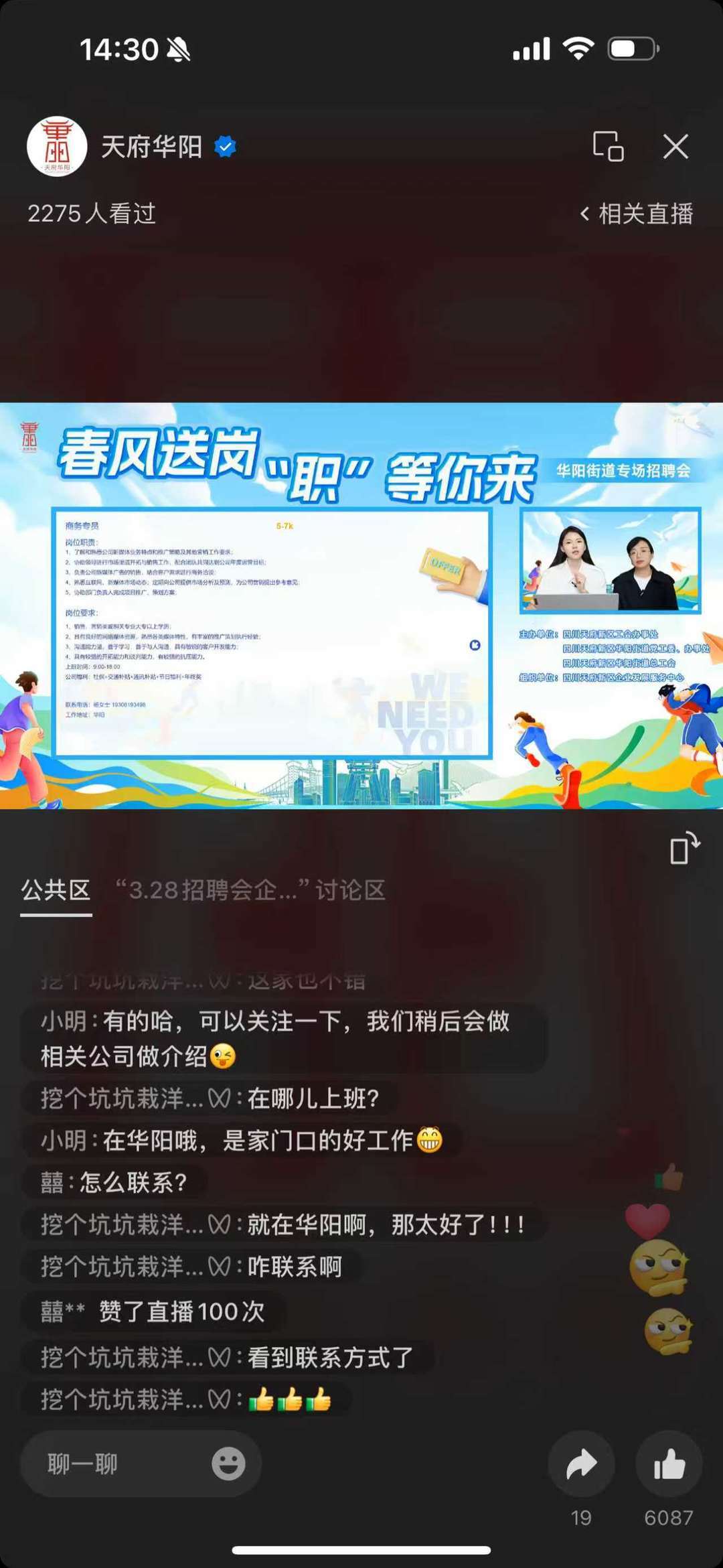 3月28日,由四川天府新区工会办事处,华阳街道党工委、办事处,华阳街道总工会主办的“春风送岗 ‘职’等你来——华阳街道专场招聘会”在三利广场外举行。本次活动采用“线下招聘+线上直播带岗”相结合的形式,将就业岗位送到群众“家门口”,为辖区居民送上实实在在的就业“红利”。