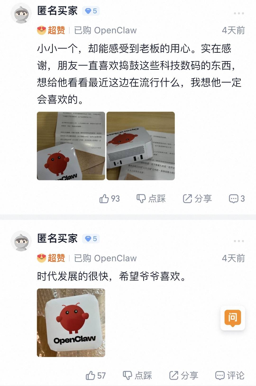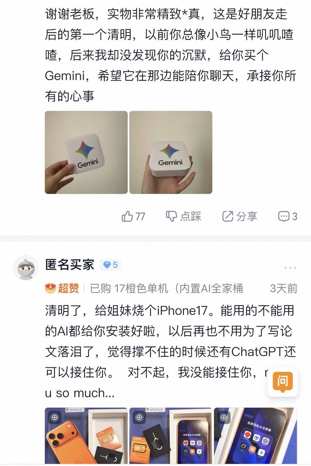 记者注意到,在评论区里,也有买家分享了自己的故事。一位买家为去世的朋友买了一款“小龙虾”OpenClaw的纸扎,其写道:“朋友一直喜欢捣鼓这些科技数码的东西,想给他看看最近这边在流行什么,我想他一定会喜欢的。”一位买家给姐妹买了一款内置了AI的苹果手机,称“能用的不能用的AI都给你安装好啦,以后再也不用为了写论文落泪了。”