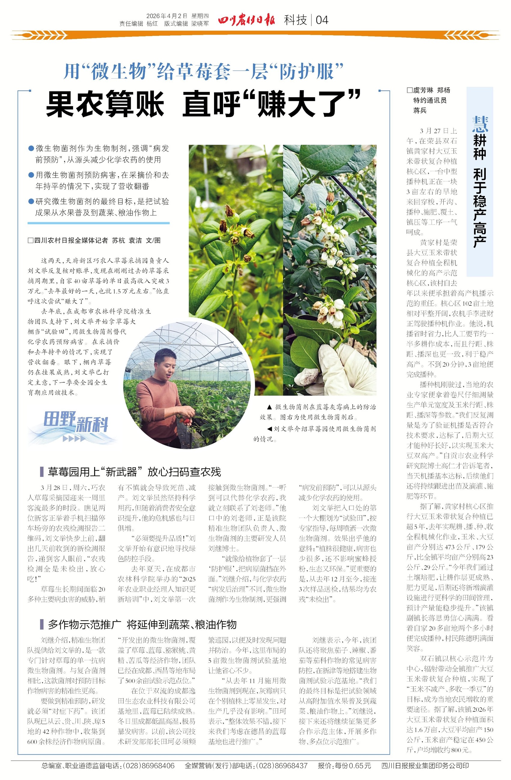 成都一个草莓园老板,在采摘价没涨的情况下,营收翻番了。秘密武器不是什么新品种,而是一种微生物菌剂——不打化学农药,提前给草莓穿上“防护服”,病害少了,农残三次送检全是“未检出”。