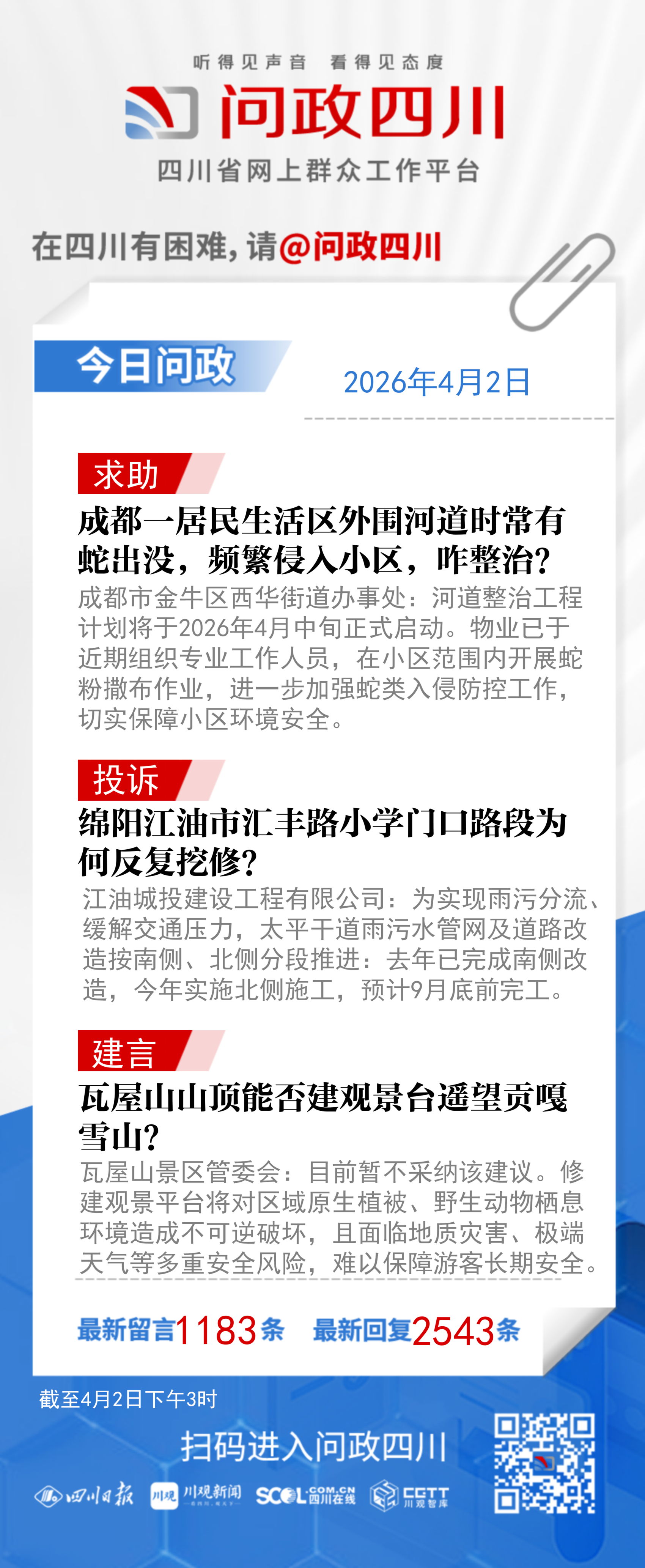 成都市金牛区西华街道办事处回复:经工作人员核实,河道整治工程计划将于2026年4月中旬正式启动。针对近期蛇类侵入小区的问题,物业公司已于近期组织专业工作人员,在小区范围内开展蛇粉撒布作业,进一步加强蛇类入侵防控工作,切实保障小区环境安全。