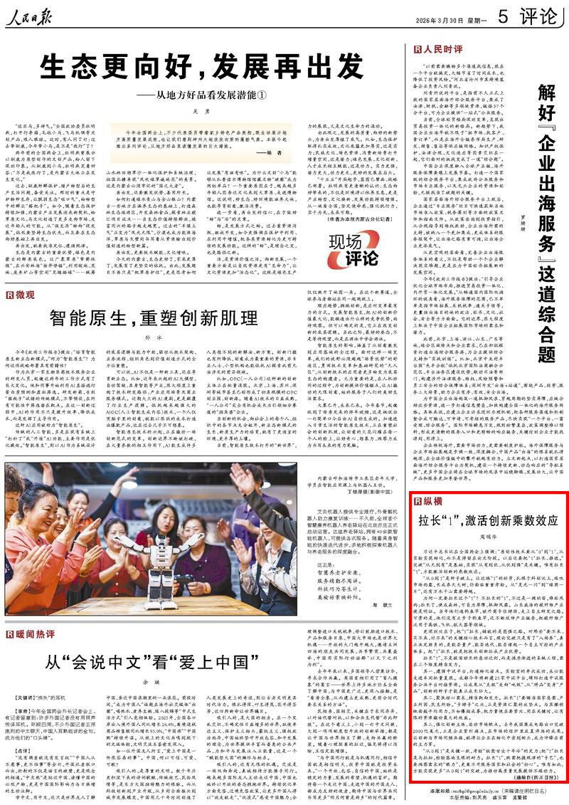 3月30日出版的《人民日报》第5版转载了四川日报评论《拉长“1”,激活创新乘数效应》,以“筷子与链条”的生动比喻,论述原创性技术“从无到有”是创新基础,实现“从有到优、从优到强”才是关键,可激活创新乘数效应,将技术优势转为产业优势。文章提出拉长“1”是系统工程,需建强中试平台打通转化堵点、聚焦核心需求精准发力、强化企业主体对接市场,以推动原创技术落地、赋能高质量发展。