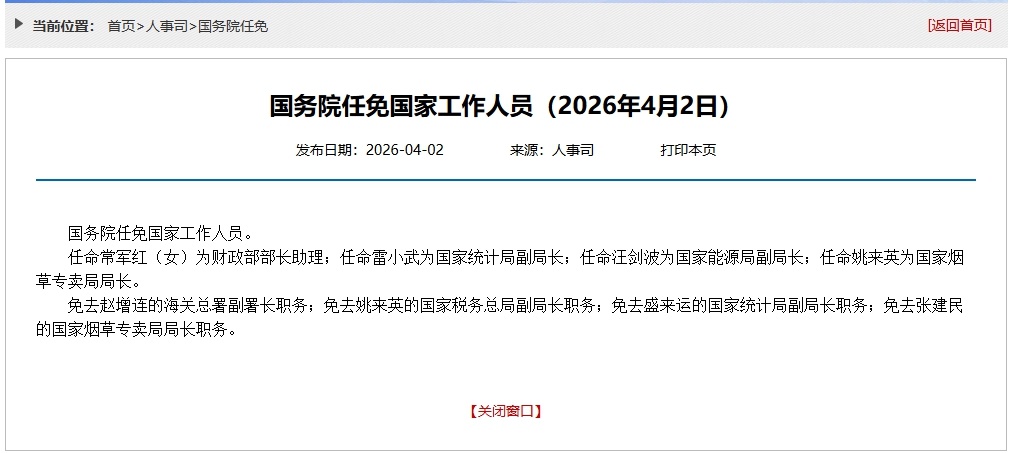 任命常军红(女)为财政部部长助理;任命雷小武为国家统计局副局长;任命汪剑波为国家能源局副局长;任命姚来英为国家烟草专卖局局长。