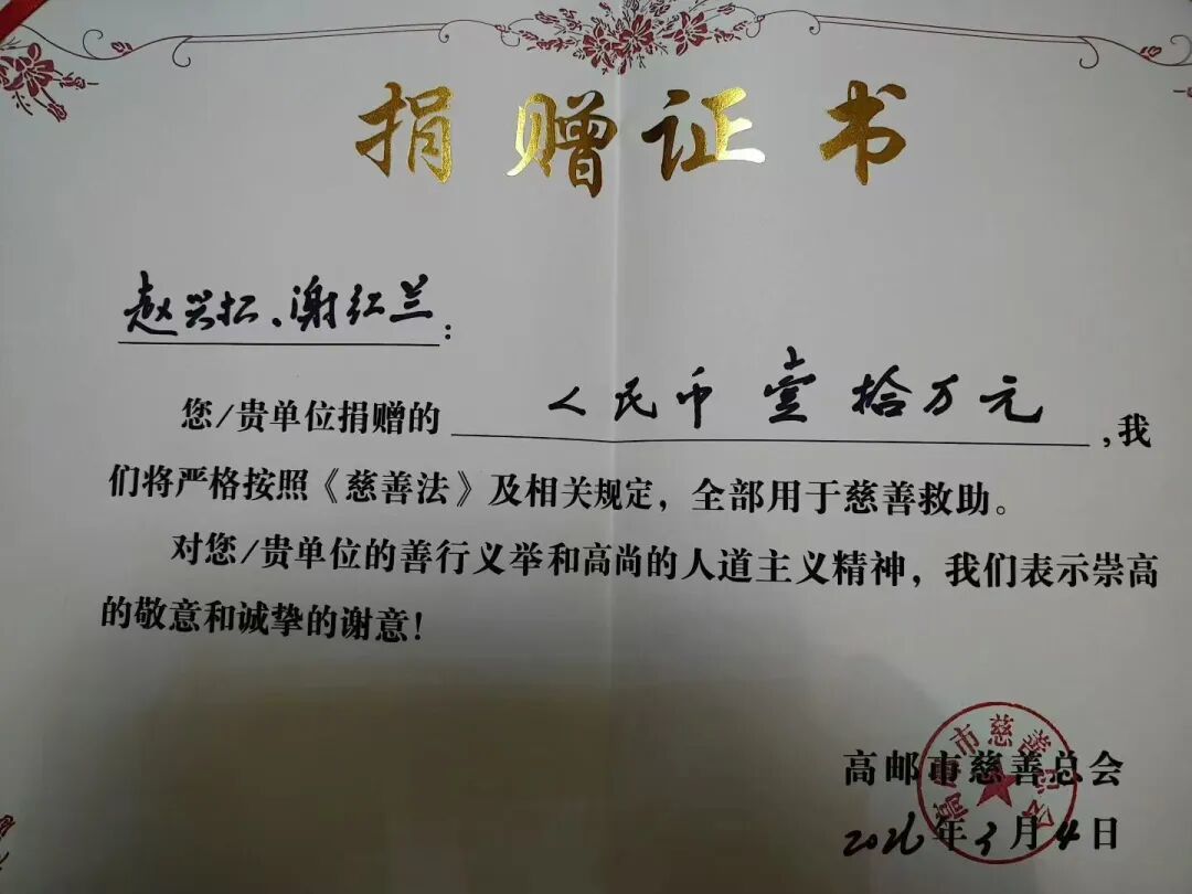 赵兴松夫妻累计捐赠善款40万元