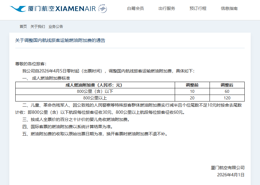 4月1日,厦门航空、中国联合航空率先发布消息显示,2026年4月5日0时起(出票时间),国内航线800公里(含)以下航段收取燃油费60元/人,800公里以上航段收取燃油费120元/人。燃油费的收取以原始出票日期为准,换开客票时燃油费不退不补。