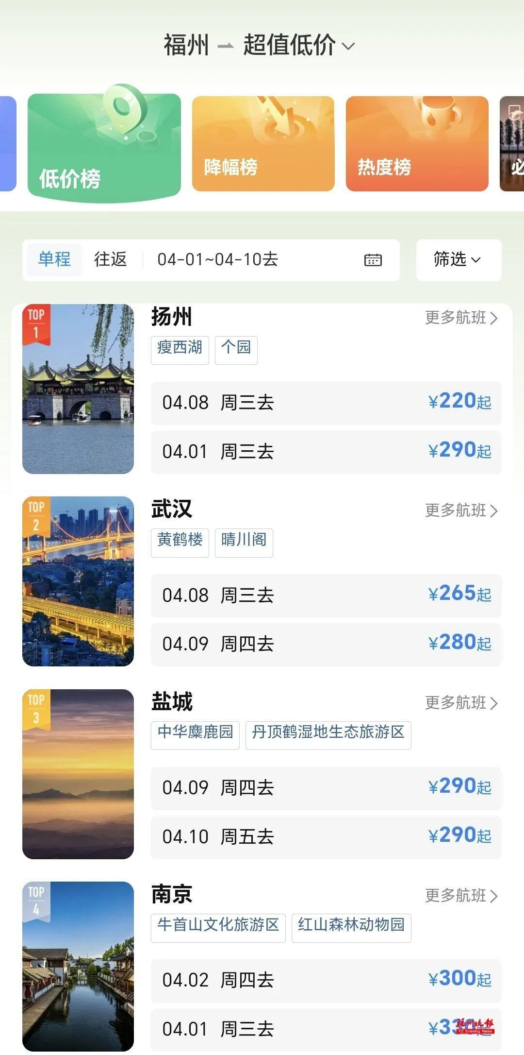 例如,4月2日福州至南京机票低至300元,4月14日福州至武汉240元,4月5日福州至郑州269元,4月10日福州至湛江270元。即使是长途航线,如福州至昆明等航班,票价也普遍处于较低折扣区间。