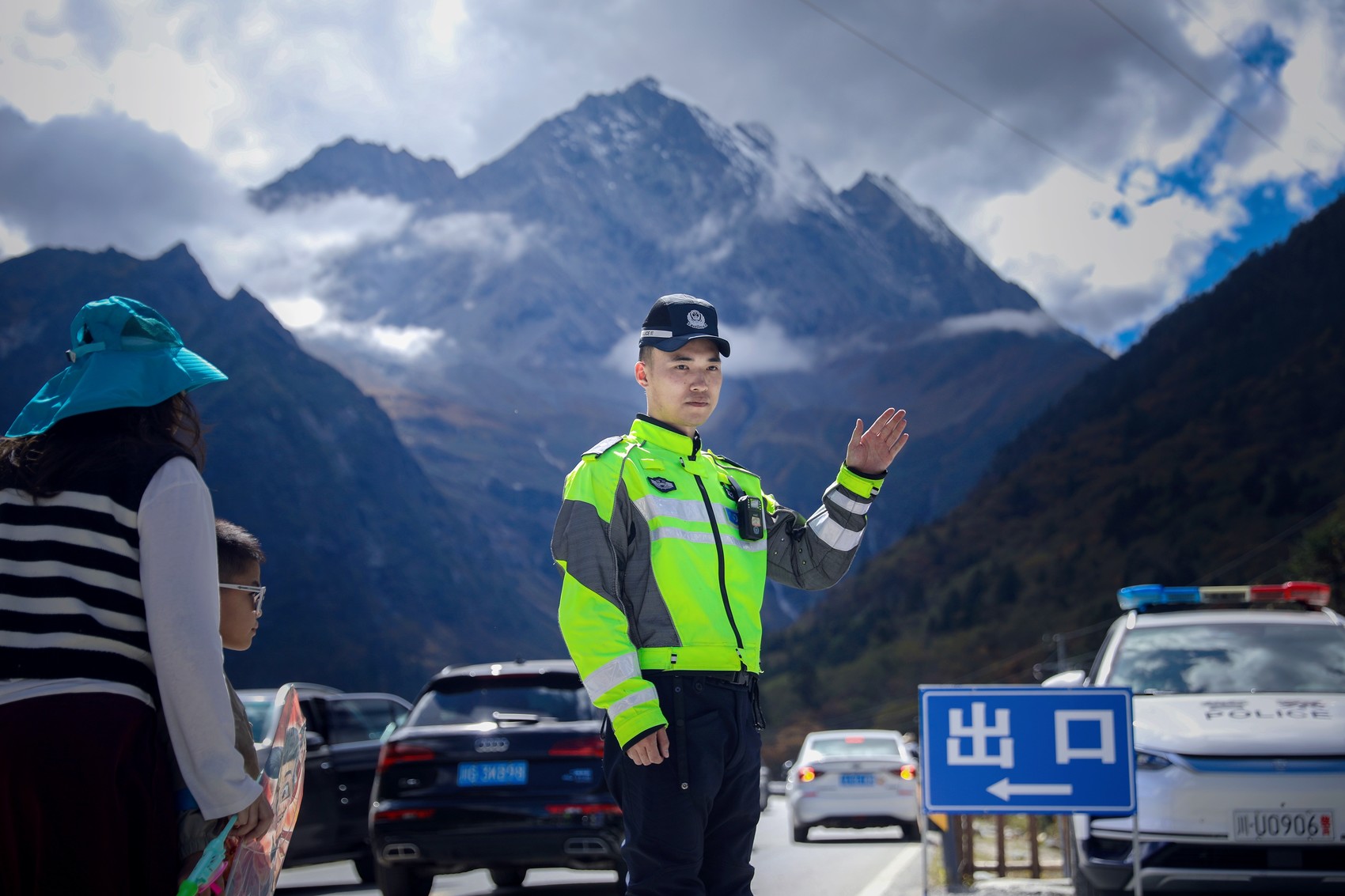 “只要游客能顺利抵达观景点,我们多站一会儿、多讲几句都值得。”在毕棚沟景区警务站,理县公安局执勤交警杨玥一边擦去额头的汗水,一边耐心为游客讲解周边游玩路线。短短十分钟,她回答了七八名游客的询问——从“哪里能拍到雪山倒影”到“哪里有医务室”,这些问题她都对答如流。