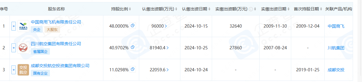 公开信息显示,成都航空有限公司作为首家国产C909飞机运营商。近日,其发生工商变更,注册资本由6.8亿元增至20亿元,增幅高达194%。此次13.2亿元的增资由中国商用飞机有限责任公司、四川航空集团有限责任公司、成都交投航空投资集团有限公司三家股东共同完成。增资后,上述三家公司的持股比例分别为48%、40.9702%、11.0298%。